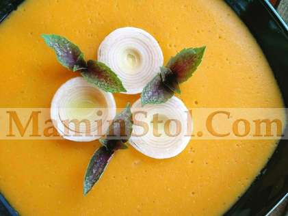 В полученное пюре вливаем сливки и доводим на медленном огне (постоянно помешивая) до кипения. Выключаем и раскладываем суп в порционные тарелки,обильно посыпая зеленым лучком и кусочками (произвольного размера) домашнего сыра.