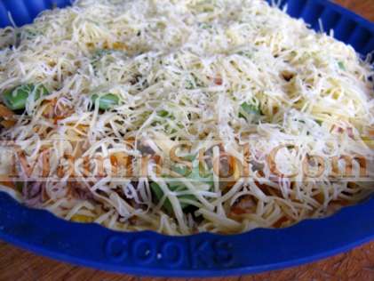 Быстро замешиваем жидкое тесто, смешав последовательно все ингредиенты для теста, заливаем им пирог и ставим выпекать на 30 минут при 200 градусах в нижней части духовки. Готовый пирог посыпать тертым сыром и зеленью и поставить ещё на минуту в горячую духовку (чтобы расплавился сыр). Приятного аппетита! |